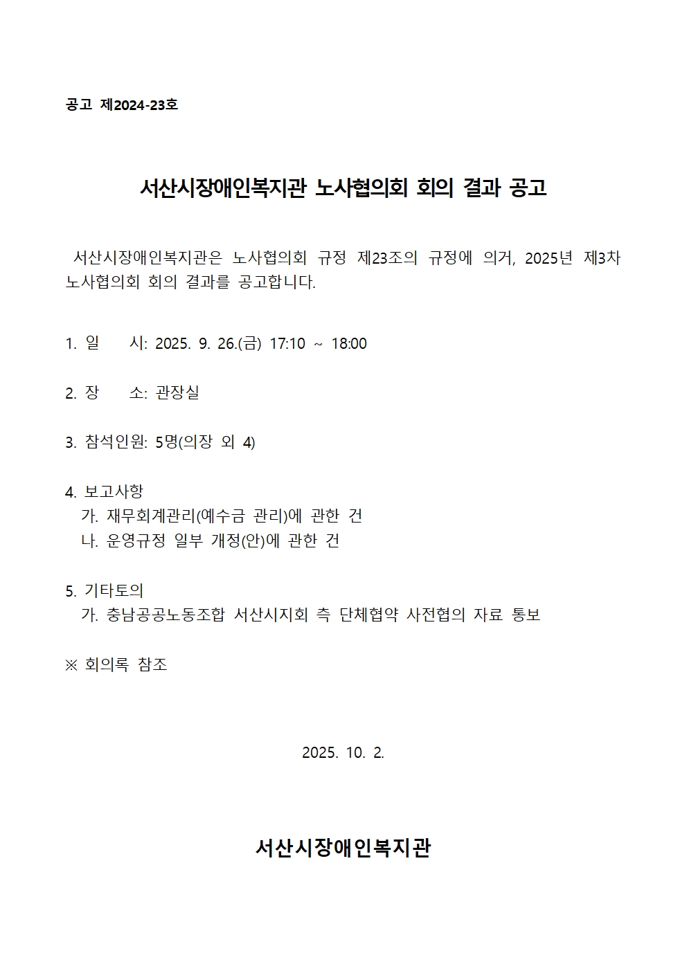 [공지] 서산시장애인복지관 노사협의회 회의 결과 공고