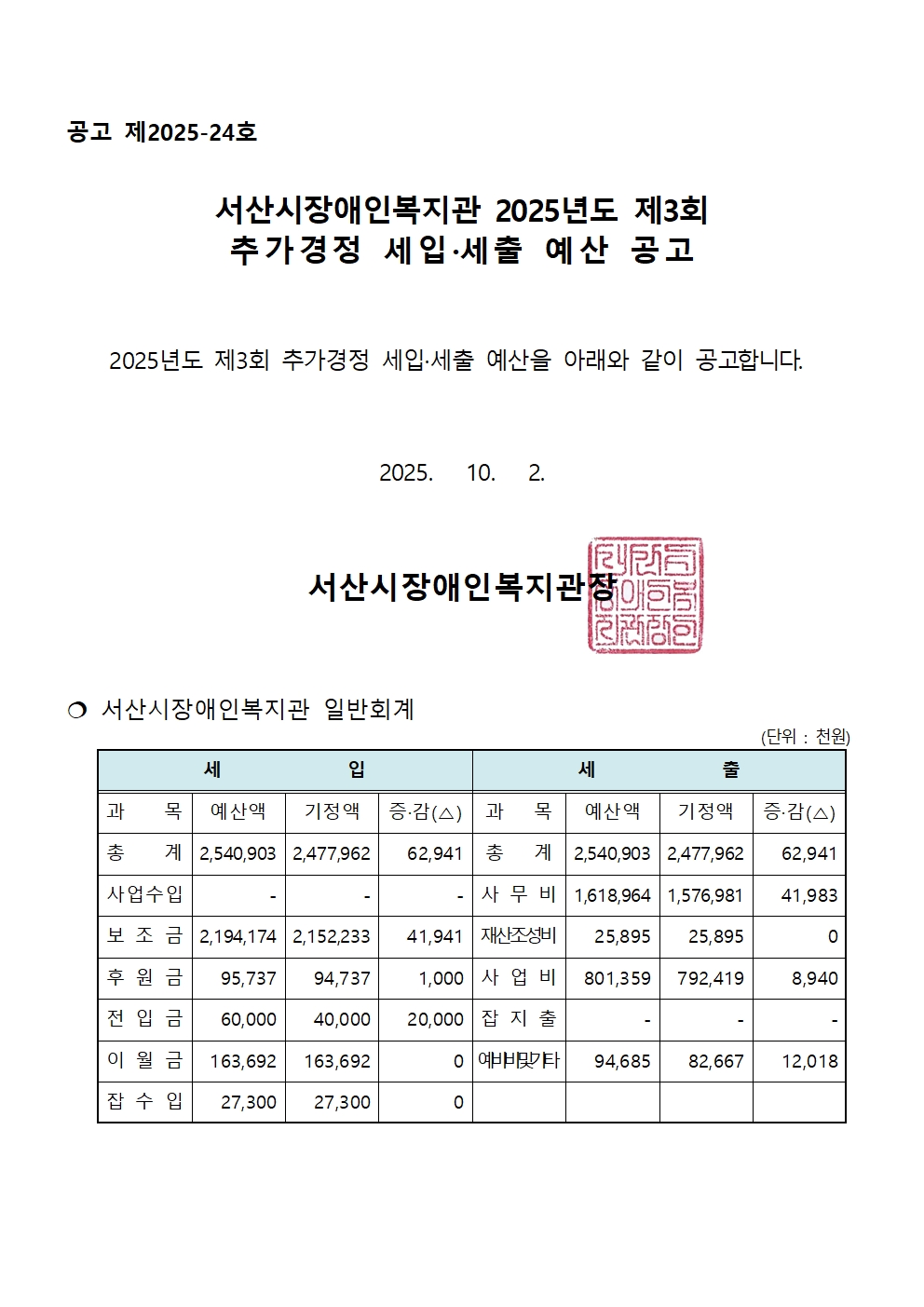 [공지] 서산시장애인복지관 2025년도 제3회 추가경정 세입
