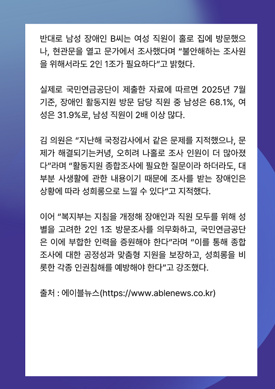 이어 “복지부는 지침을 개정해 장애인과 직원 모두를 위해 성별을 고려한 2인 1조 방문조사를 의무화하고, 국민연금공단은 이에 부합한 인력을 증원해야 한다”라며 “이를 통해 종합조사에 대한 공정성과 맞춤형 지원을 보장하고, 성희롱을 비롯한 각종 인권침해를 예방해야 한다”고 강조했다.