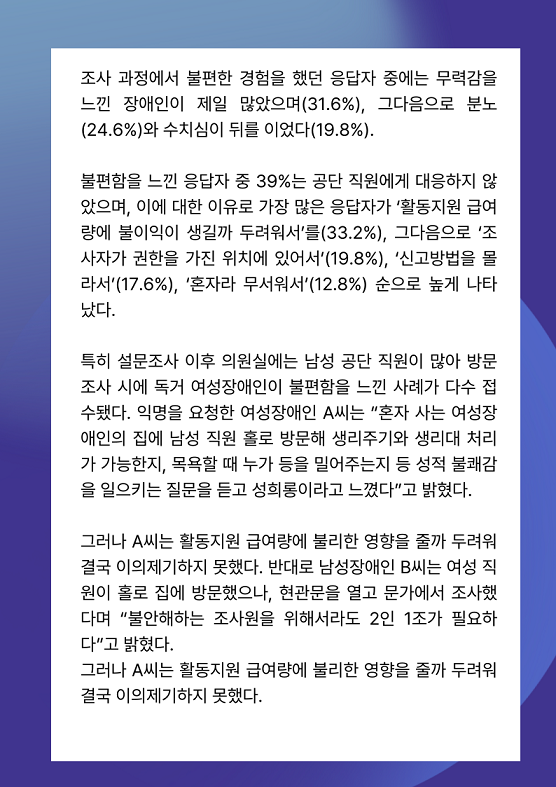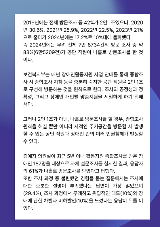 그러나 A씨는 활동지원 급여량에 불리한 영향을 줄까 두려워 결국 이의제기하지 못했다. 반대로 남성장애인 B씨는 여성 직원이 홀로 집에 방문했으나, 현관문을 열고 문가에서 조사했다며 “불안해하는 조사원을 위해서라도 2인 1조가 필요하다”고 밝혔다.